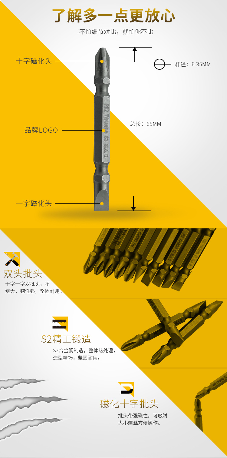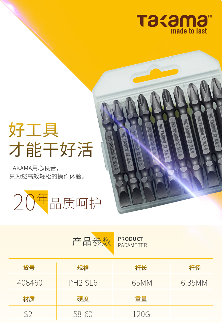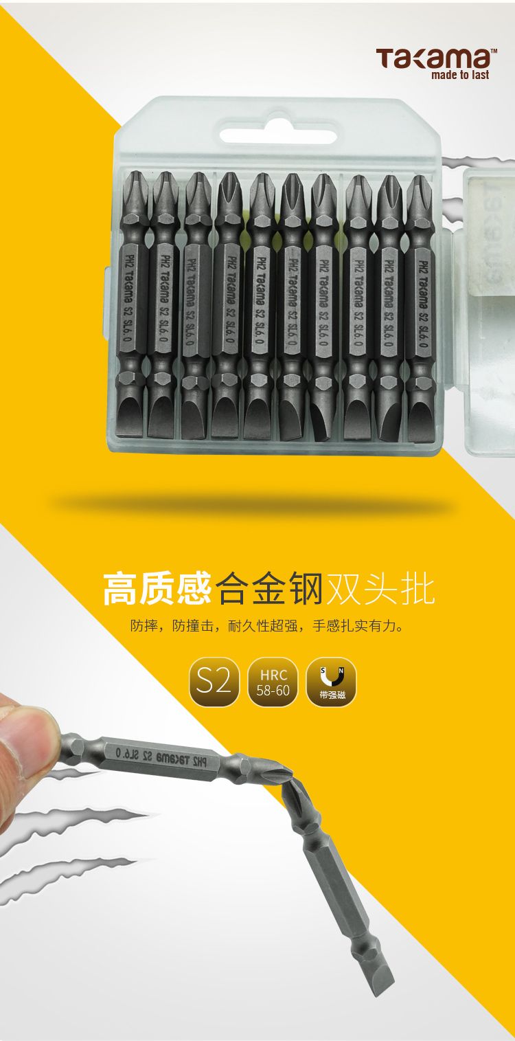 takama(高松)408460 双头十字一字螺丝批头套装10件套电动螺丝刀批头起子头旋具头S2带强磁PH2SL6*65